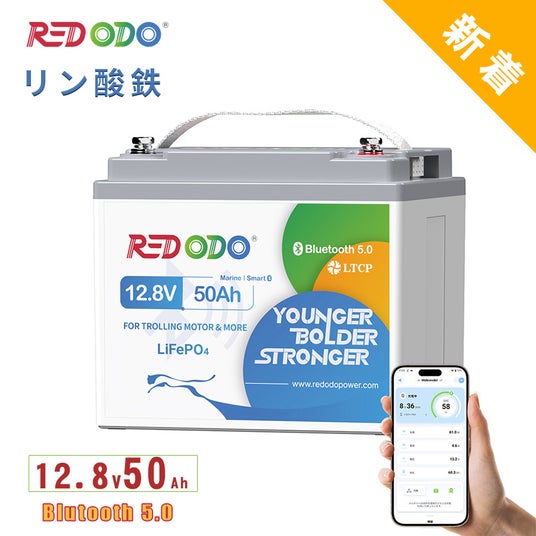 12V 50Ah (Bluetooth付き+低温保護)Bluetooth5.0モジュールが搭載されており、Redodoアプリに接続することで、バッテリーの充電状態(SOC)、電力(W)、電圧(V)、容量(Ah)、電流(A)、温度(℃)、サイクル寿命などをモニターすることができます。