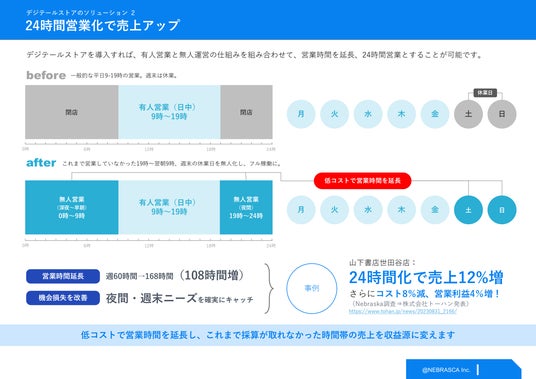 こうした成果は、特定の1店舗・1業態に限られたものではありません。Nebraskaの導入実績では、書店に加え、食品スーパー、文具、古着など複数業態においても、無人化による売上機会の拡大、営業時間延長による収益創出、オペレーション効率化によるコスト最適化といった同様の傾向が確認されています。