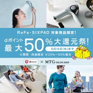 株式会社NTTドコモ(以下、ドコモ)は、美容ブランド「ReFa」やEMS※1機器「SIXPAD」など、美容と健康をテーマに魅力ある商品を販売する「MTG ONLINESHOP」※2において、対象商品をご購入されたお客さまを対象に、最大50%分のdポイント(期間・用途限定)を進呈する「ReFa・SIXPAD対象商品限定! dポイント最大50%大還元祭!」(以下、本キャンペーン)を2023年5月15日(月)から2023年6月14日(水)までの期間で開催いたします。