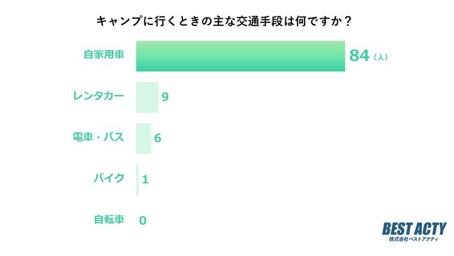 キャンプに行くときの主な交通手段について100名にアンケートを行ったところ、「自家用車」と回答する人が最も多い結果となりました。