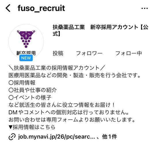 扶桑薬品工業株式会社(本社:大阪市中央区、代表取締役社長:戸田幹雄)は、就職活動をされている方々へ向けて情報発信を行う、公式Instagramアカウントを開設いたしました。