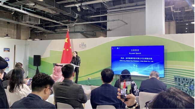 近日、太陽光発電(PV)産業および蓄電池(ESS)産業の世界大手かつ革新的企業ジンコソーラーは、アラブ首長国連邦・ドバイで開催された「国連気候変動枠組条約第28回締約国会議(COP28)」に招待され、ジンコソーラー副会長錢晶氏が代表として出席しました。錢晶氏はCOPに8回目の参加となり、複数の注目のサイドイベントでスピーチする機会に恵まれました。これは、ジンコソーラーが太陽光発電分野でのリーダーシップを示し、地球規模の気候変動への対処に向けた不断の努力を表しています。