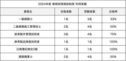 2024年度は若手社員を中心に積極的な挑戦が目立ち、計6種の資格に対し延べ17名が受験し、合格者は10名となりました。今後は対象資格の拡充や支援内容のさらなる充実を図り、より多くの社員が挑戦しやすい環境づくりを行うことで、組織全体の専門性と競争力の強化につなげていきます。