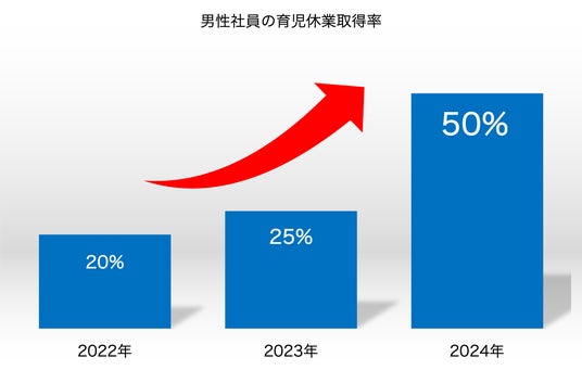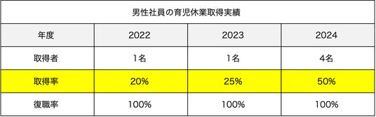 当社における男性社員の育休取得率は年々向上しており、2024年度の実績では半数を超えました。最近では、数か月単位の長期育休を取得する社員も見られるようになった一方で、取得に至っていない社員がいることは、当社としても大きな課題であると認識しています。今後も、希望する社員がためらうことなく育児休業を取得できるよう、制度の周知と理解を一層深めるとともに、社内の空気づくりを進めてまいります。あわせて、継続的なサポートを通じて、男性社員の育休取得率100%の早期達成を目指し、着実に取り組みを進めてまいります。