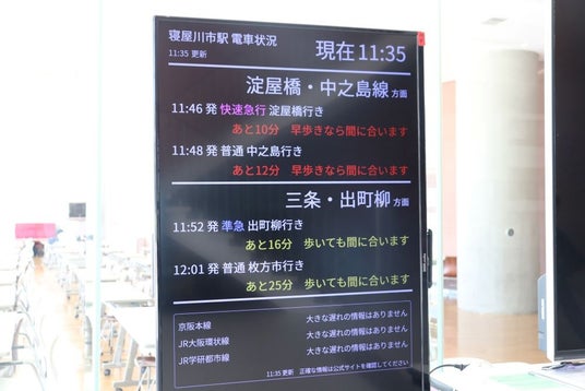 大阪電気通信大学(大阪府寝屋川市・四條畷市/学長:塩田邦成)プログラミング研究会の学生2人(情報通信工学部情報工学科3年)が、寝屋川キャンパス最寄り駅の電車の運行情報掲示板を開発し、10月半ばに学内に設置した。開発した運行情報掲示板は、京阪本線「寝屋川市駅」から発車する電車の時刻や、「どれぐらいの速度で歩けば間に合うか」などの情報を表示。運行情報は京阪電車の許可を得て取得しており、遅延情報も知ることができる。学内での評判もよく、SNSなどでも話題となっている。