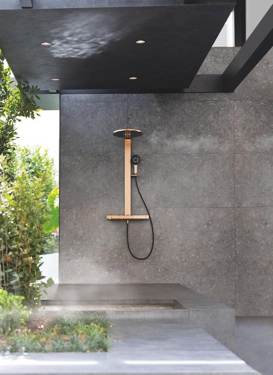 GROHE Rainshower Aqua Pureシャワーシステムは、デザイン性とウェルネス機能を融合した最新のシャワー設備です。内蔵のアクアピュアフィルターにより、塩素やニオイを除去し、髪や肌への優しさを実現した精製水を供給します。デザイン面では、ミニマルな美しさを追求し、ローレット加工のメタルボタン付きSmartControlサーモスタットで直感的な操作が可能です。豊富なカラーバリエーションを選べるほか、ガラス製のパーツも選択できます。シャワーヘッドは広範囲で「レイン」と「アクティブレイン」の2パターン、ハンドシャワーは3種類のスプレーを楽しめます。リラクゼーションとウェルビーイング空間を実現し、本格的なホームスパ体験とバスルームの上質な静けさ、美しさをもたらします。