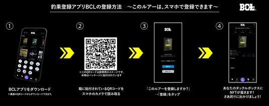 パッケージに貼付されたQRコードをスマートフォンで読み取り、BCLアプリをダウンロードするだけで、購入したルアーに対応した「ルアーNFT」が自動的に発行されます。NFTには個体識別番号が記録されており、自分がそのルアーで釣った釣果がすべて自動で紐づいて記録されていきます。