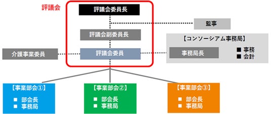3つの事業部会が研究活動を推進。コンソーシアム全体の活動を評議会が統括します。
