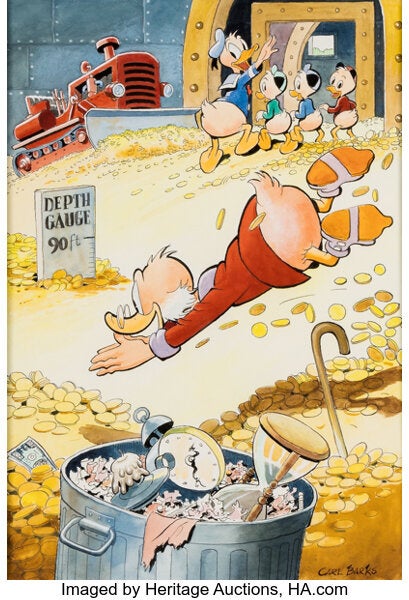 ディズニーの伝説的アーティストであるカール・バークス氏が、スクルージおじさんの物語を描いた「Uncle Scrooge McDuck: His Life and Times」という本のために制作した12枚の水彩画の中でも特に傑作といえる一枚。バークス氏の直筆サイン入りで、豪華な金色の額縁に収められています。