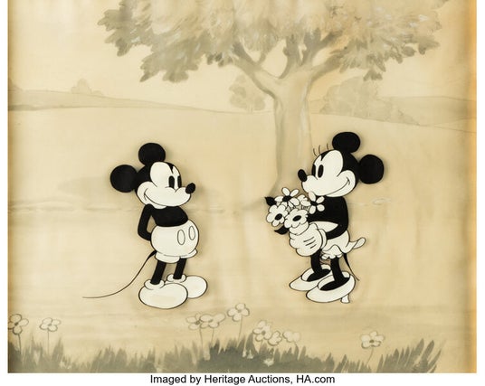 短編アニメーション映画『ミッキーの日曜日』からニトロセルロースシートに描かれた二人の恋人の手描きセル画と、『ミッキーのピクニック』制作用の手描き背景画が組み合わされています。1930年代の作品のセットアップは大変希少で、アニメーションアートコレクションの中でも至宝の品と言えます。『ミッキーの日曜日』冒頭で、ミニーがミッキーから贈られた花束の香りを楽しんだ直後のシーンです。
