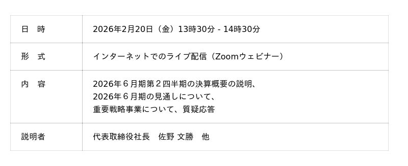 株式会社エンビプロ・ホールディングス(本社:静岡県富士宮市、代表取締役社長:佐野文勝、以下「当社」)は、2026年6月期第2四半期決算説明会を2月20日(金)13時30分より開催いたします。この機会を通じまして、当社に関するご理解を一層深めていただければ幸いに存じます。
