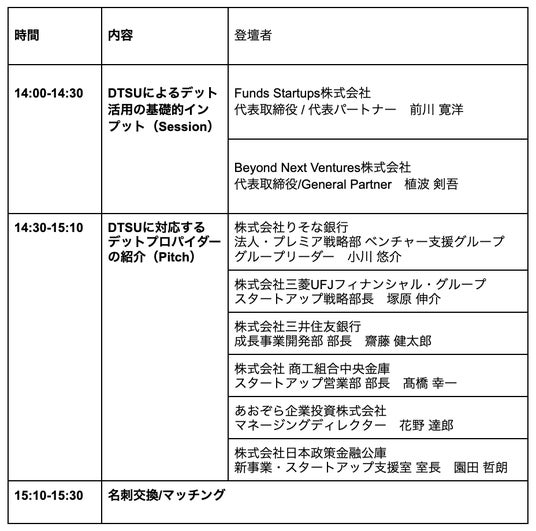 本イベントは、当社とBeyond Next Ventures社との共催イベントです。本イベントでは、DTSUに特化したベンチャーデットをはじめとするデットファイナンスの活用方法がインプットできるセッションに加え、DTSUに対する資金供給に積極的な金融機関等、全6社のキーパーソンらが一堂に会し、各社の取り組みを知ることができる金融機関リバースピッチが行われます。また、イベント終了後には、参加者同士のマッチングや登壇した金融機関とのマッチングが行われます。