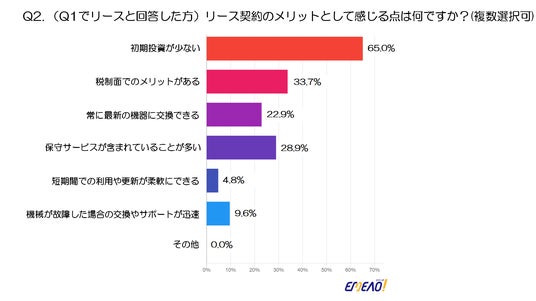 リース契約のメリットとして最も多く挙げられたのは「初期投資が少ない」で、65%の回答を得ています。次いで、「税制面でのメリットがある」が33.7%、「常に最新の機器に交換できる」が22.9%、「保守サービスが含まれていることが多い」が28.9%という結果でした。