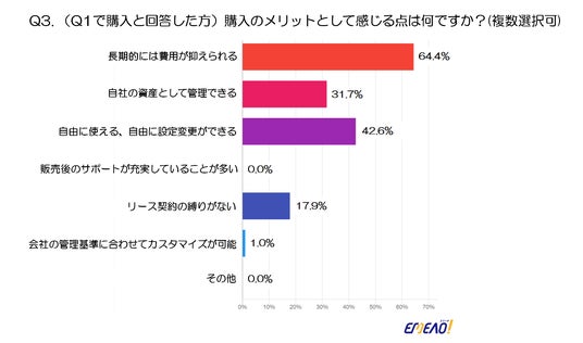 購入のメリットとして最も多く挙げられたのは「長期的には費用が抑えられる」で、64.4%の回答を得ています。次いで、「自由に使える、自由に設定変更ができる」が42.6%、「自社の資産として管理できる」が31.7%という結果でした。