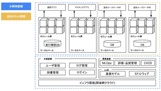本プロジェクトは、2025年7月に発表したPoC(プレスリリースはこちら)を経て、クラウド閉域網環境における共通基盤の開発、および「翻訳・マスキング」機能の実装を完了しました。また、さらなる実用性を追求するため、「業務文書自動作成」と「稟議書レビュー」に関する追加検証を現在試行中です。