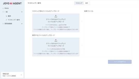 - 【利便性】専門知識を必要とせず、ファイルを置くだけで完結する操作対象ファイルをアップロードしてボタンをクリックするだけで処理が実行される「プロンプトレスUI」を採用しました。これにより、専門的な知識の有無にかかわらず、全ての行員が「JOYO AI AGENT」を使いこなせる環境を提供します。