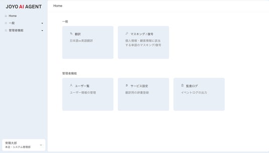 - 【拡張性】横展開を加速させる「ローカルLLM運用基盤」を設計システムの中核として、共通のローカルLLMと、ログイン・ログ管理等を担う「ローカルLLM運用基盤」を構築しました。翻訳やマスキングといった「JOYO AI AGENT」搭載機能は、すべてこの共通基盤の上に乗る「アプリ」のような形で実装されています。 この設計により、今後新しい業務にAIを導入する際には、システム全体を一から作り直す必要がなく、追加機能だけをスピーディかつ効率的に開発できます。