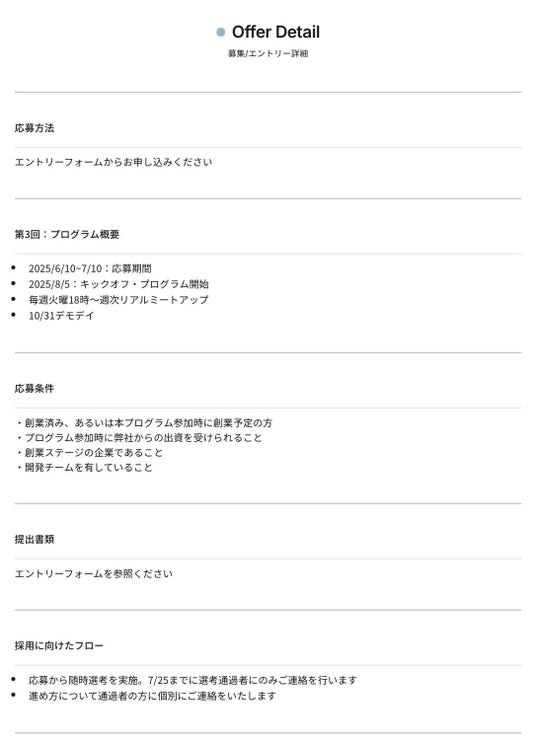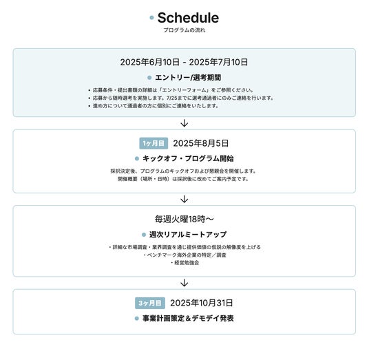 第3期となる本プログラムでは、採択時にON&BOARDからの出資をコミット。約3ヶ月の濃密な期間を通じて、参加者の皆様と共に事業テーマの発見から検証、事業仮説の構築、事業計画の策定、そして最終的なデモデイでの発表までを力強くサポートいたします。
