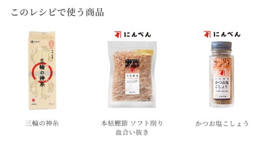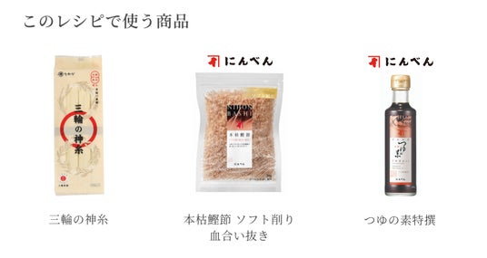 アレンジレシピは“香り”を意識して製品を選ぶ「ローリングストック」は、いつも食べている食品を少し多めに買い置きしておくことから始まります。ストック食材を食べ慣れするには、おいしく食べる日常のレシピアイデアの備えも大切です。三輪の神糸は、フランスパンの材料としても使用される準強力粉を原料に製麺されてるため、上質な素麺の小麦の香りを楽しめます。にんべんの血合い部を取り除いた本枯鰹節は生臭さがなく風味が豊かな逸品!