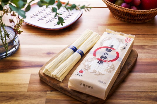 素麺の発祥は1300年前、奈良 三輪の里の肥沃な土地と三輪山から流れ出る巻向川の清流が、小麦栽培に適することから、大神神社の大神主であった大神朝臣狭井久佐の次男穀主が種を蒔かせ、その小麦を原料に神意に沿って素麺の生産を始めたと伝承されており、素麺は保存食としても有効で、当時飢饉に苦しむ多くの民を救ったとも言われております。