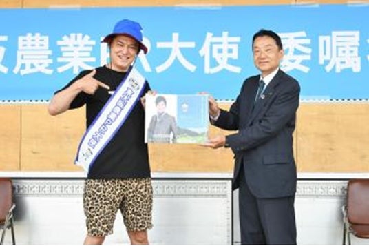 東大阪市では、農業の分野で活躍され、多くの人から親しまれ、本市にゆかりのある方に、東大阪市の農業の魅力を広く発信してもらうため「東大阪農業PR大使」を委嘱しています。令和5年5月21日に、シャンプーハット・てつじさんが酒米づくりを行っている池島町の水田近くで委嘱状交付式を行い、野田市長から委嘱状を手渡しました。交付式では、「東大阪市の農業も、どんどん大きくなってどんどん舞い上がってほしい」と話されており、今後、東大阪の農業の魅力をさまざまな角度から広く発信することにご協力いただいております。