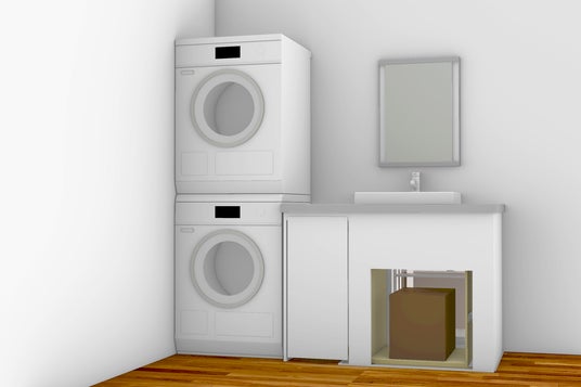 洗面台に組み込んだエレベーターで、床下収納との荷物のやりとりを可能にするデバイスです。