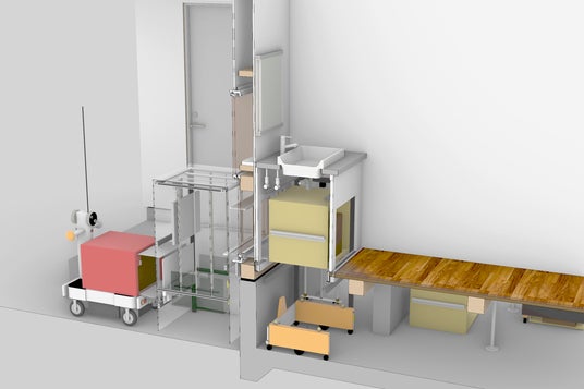 床下に収納した荷物を洗面台下のエレベーターから取り出す様子(わかりやすくするため、シャッターを省略しています)
