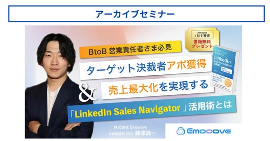 株式会社Emooove(本社:東京都渋谷区、代表取締役CEO:藤澤諒一)は、2024年12月4日に開催されたウェビナー「ターゲット決裁者アポ獲得&売上最大化を実現する「LinkedIn Sales Navigator」活用術とは」を、当社HP内で限定公開いたしました。本ウェビナーでは、LinkedInを使いこなすことで、テレアポ等の従来の営業手法から脱却し、より戦略的で効果的なアプローチ方法について詳しく解説しています。