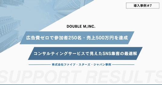 セミナーマーケティングを提供する株式会社ダブルエム(所在地:名古屋市千種区、代表取締役:安井勝、以下当社)は、出版・編集事業を主軸としてBtoB領域で実績を築いてきた株式会社ファイブ・スターズ・ジャパン(本社:東京都、代表取締役:福島美千子、以下ファイブ・スターズ・ジャパン)が新規に開始したBtoC向けセミナー事業において、当社のコンサルティングを活用し、広告費ゼロで250名超の集客および500万円超の売上達成を実現した事例を公開いたします。