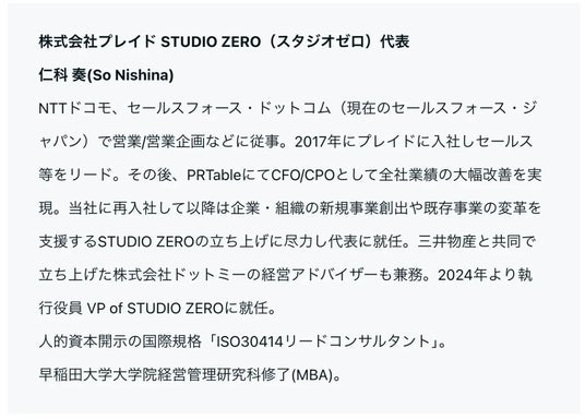 スタジオゼロは、企業の組織変革や事業共創、新たな価値創造を支援しています。代表の仁科は、人的資本に関する情報開示ガイドライン「ISO 30414リードコンサルタント / アセッサー」認証資格を取得しており、人的資本経営のアドバイスができるスキルが認められています。