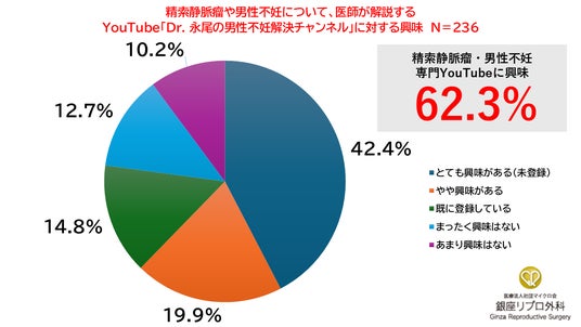 また、医師が解説するYouTube「Dr. 永尾の男性不妊解決チャンネル」への関心については、「とても興味がある(未登録)」30.1%(71人)、「やや興味がある」29.2%(69人)、「既に登録している」14.8%(35人)で、合計74.2%(175人)が一定の関心を示しました。
