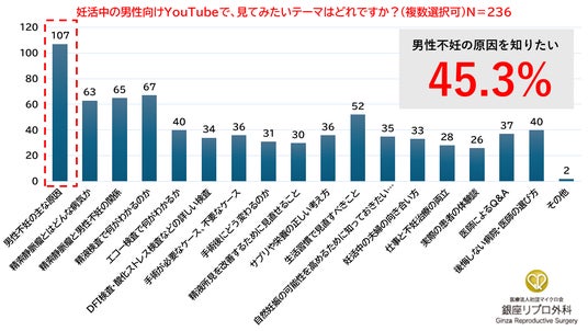 銀座リプロ外科は今回、妊活中または妊活予定の男性236人を対象に、男性不妊に関するYouTube動画について、どのような内容に関心があるのかを調査しました。まず、「妊活中の男性向けYouTubeで、見てみたいテーマはどれですか」と尋ねたところ、最も多かったのは「男性不妊の主な原因」45.3%(107人)でした。次いで、「精液検査で何がわかるのか」28.4%(67人)、「精索静脈瘤と男性不妊の関係」27.5%(65人)、「精索静脈瘤とはどんな病気か」26.7%(63人)、「生活習慣で見直すべきこと」22.0%(52人)という結果でした。
