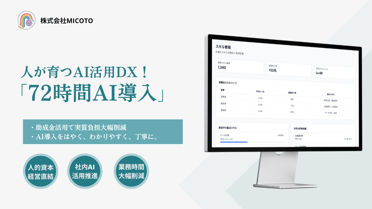 株式会社MICOTO(本社:東京都/代表取締役:濱田憲一)は、AI導入を最短72時間で実現する新サービス「72時間AI導入」パッケージの提供を開始いたしました。