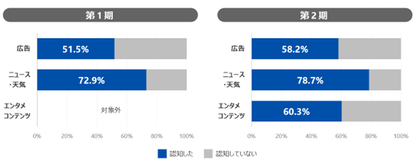 - コンテンツの認知状況第一期、第二期を通じて、就業者の約55%が広告コンテンツを認知していることが判明しました。特に第二期では、コンテンツ数を2件から7件に増やしたことで、個々のコンテンツの認知度向上が確認されました。
