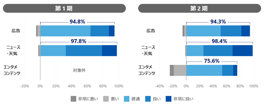 - コンテンツに対する印象第一期、第二期を通じ、就業者における、広告、ニュース・天気に対する印象は、90%以上が「普通」、「良い」、「非常に良い」となりました。第二期ではコンテンツ数を増やしましたが、一般的な広告媒体においてしばしば見られるネガティブな反応の増加は確認されず、就業中に利用されるエリアでの広告放映の可能性が示唆されました。一方、ゲーム性を取り入れたエンタメコンテンツに関しては、受容性に課題が残る結果となりました。
