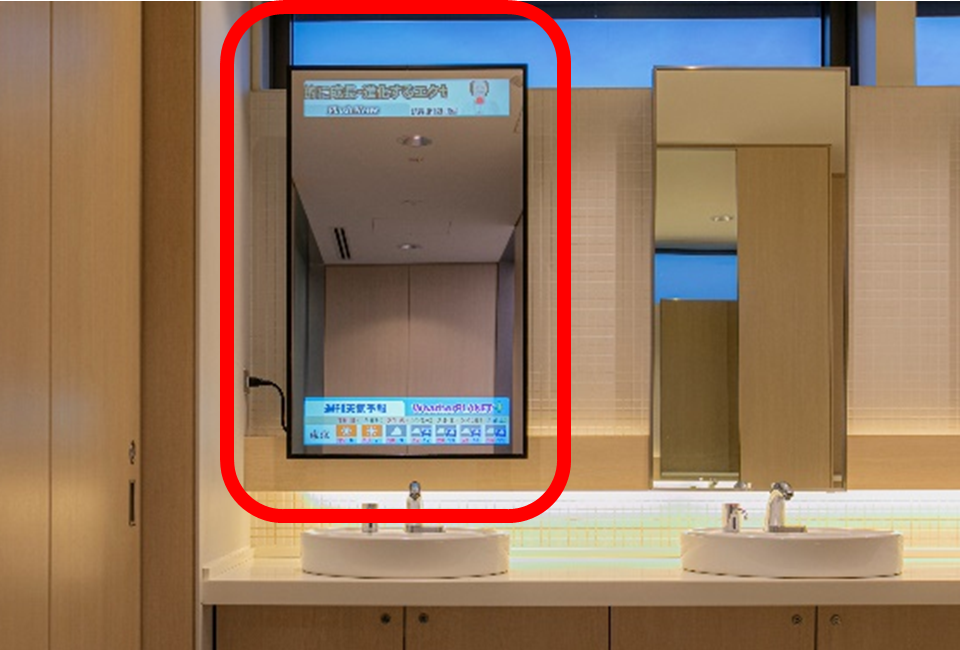 本実証は、新丸ビルに就業する三菱HCキャピタルおよびAGCの従業員を対象に、二段階で実施しました。両社が入居する各フロアの化粧室に、AGCが販売するディスプレイ一体型ミラー