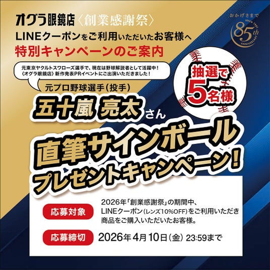 LINEクーポンをご利用いただいたお客様へ特別キャンペーンとして、創業85周年記念イベントにご登場いただいた元ヤクルトスワローズ選手で、現在野球解説者として活躍中の五十嵐 亮太さん「直筆サインボール」をプレゼント(抽選5名様)いたします。