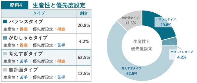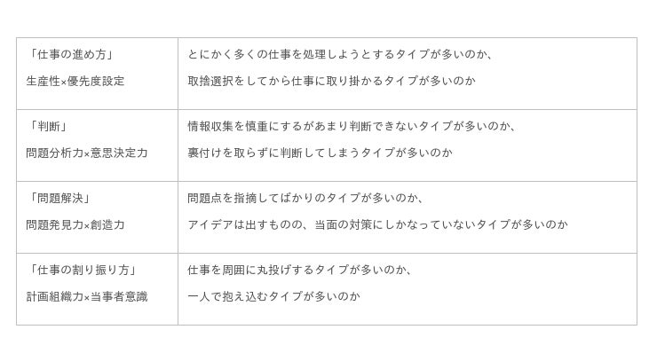「仕事の進め方」「判断」「問題解決」「仕事の割り振り方」を、それぞれ4つのタイプに分け、その割合から職場で起こりがちな問題や改善方法を明らかにします。