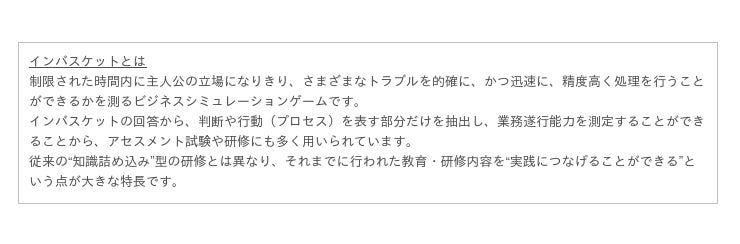 実施内容 :スコアリング対象のインバスケット問題を実施いただきます