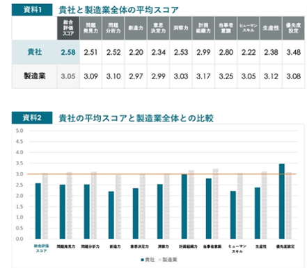 総合評価スコアだけでなく、10の能力値を評価項目ごとに比べることで、業界特有の傾向から貴社における能力発揮度の特徴や課題をあぶりだし、改善すべき事柄を明確にします。