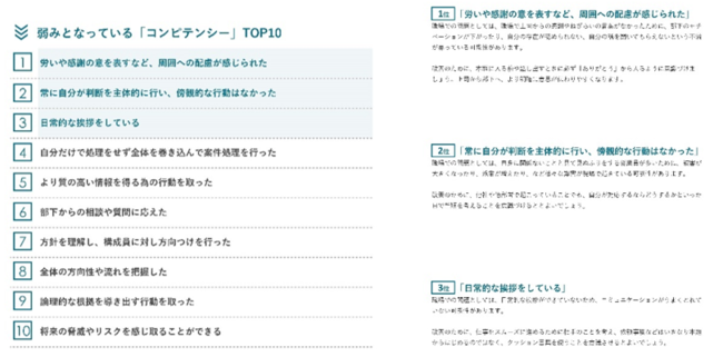 そのうち、貴社の社員は具体的にどのような行動を得意とし、どのような行動を苦手としているのかをそれぞれ10位までランキング化します。
