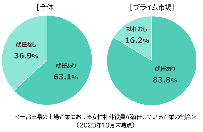 女性社外役員を採用している企業数は1年で1,324社から1,572社へ248社増加しており、女性社外役員が就任している企業の割合は54.2%から63.1%へ1割増加しました。また、東証プライム市場で女性社外役員が就任している企業の割合は83.8%と8割を超えています。