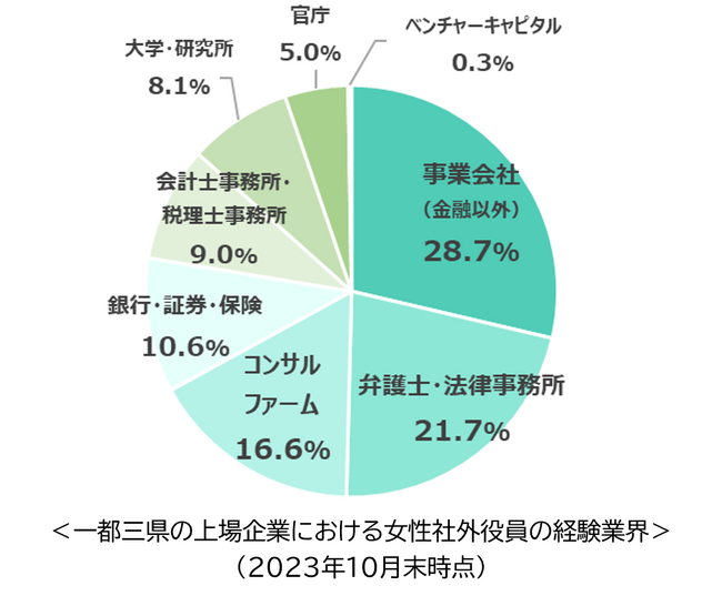 2023年10月末時点での女性社外役員の経験業界は、事業会社経験者(金融以外)が28.7%、次いで弁護士・法律事務所経験者が21.7%、コンサルファームが16.6%となりました。※4社外役員を役職別にみると、取締役は経営経験がある事業会社出身者の割合が最も多いのに対し、監査役や監査等委員を担う役員の過半数が弁護士や会計士で、監査業務に関しては法律・会計に精通している専門家への需要が高い傾向にあります。