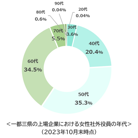2023年10月末時点での女性社外役員の年代は50代が35.3%と最も多く、次いで60代(34.5%)、40代(20.4%)という結果になりました。50代は企業の経営経験や社外役員経験が豊富であるため、企業からの需要が高まっています。