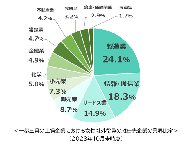 女性社外役員の就任先企業の業界比率を見ると、最も多いのは製造業(24.1%)で、次いで情報・通信業(18.3%)となりました。女性社外役員の業界別の就任率は、情報・通信業は49%で、約2社に1社が女性の社外役員を登用していることが分かりました。