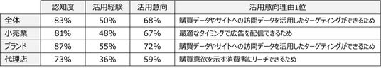 - いずれの業界もコマースメディアの活用意向は68.9%と関心が高く、活用意向の理由としては「購買データやサイトへの訪問データを活用したターゲティングができるため」が40.4%と最も高かった。