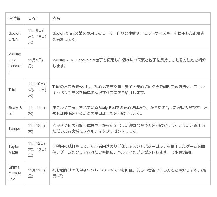 期間中の平日、7店舗にて、よりお買い物が楽しくなる、生活が豊かになるワークショップを開催いたします。参加費は無料です。※参加人数には限りがありますので、予めご了承ください。