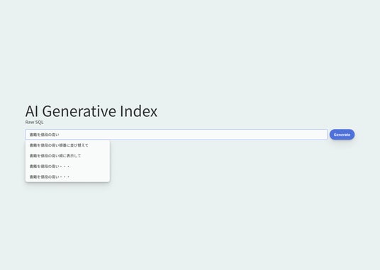 実際の動作では、現在利用している管理画面等に2ページほどを差し込む構成を取ります。追加され画面を開くと、検索画面に日本語で指示を入力するページが開きます。そのページに出力したいデータを日本語で指示を出すと、 AI が SQL に変換し実行することでデータベースを検索します。SQL等の知識がある人がある程度の仕組みを分かったうえで利用するとさらに効率的に利用できるとは思います。