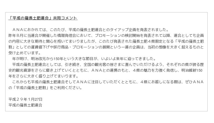 ANAと平成の薩長土肥連合は昨年8月29日(月)に明治記念館で開催した情報発信会において、平成30年の明治維新150年に向けた、タイアップによる取組を進めていくことを公表しております。このたび、ANAから『平成の薩長土肥割』という名称の4県限定のおトクな運賃や旅行商品などが発表されましたのでお知らせします。また、今回の発表に関してANAより寄せられた志岐取締役常務執行役員からのコメント及び平成の薩長土肥連合共同コメントは以下のとおりです。