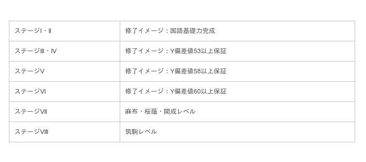 受講ステージはI~VIIIに分かれ、テストによって受講ステージが決まります。